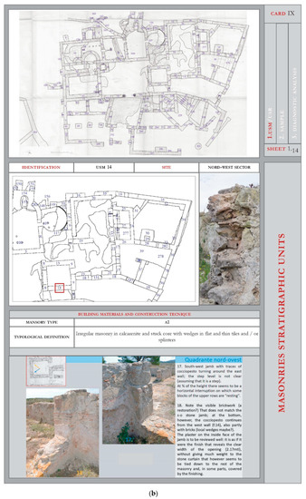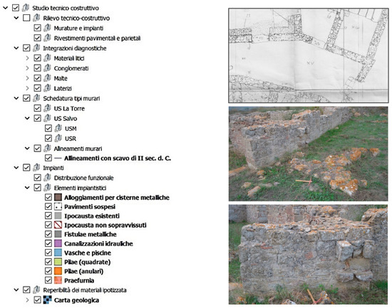 At the end of filing of the USM and USR, all material produced was conveyed and included in the ArcheoGIS project in terms of contextual deepening that can be consulted through interactive external links (Figure 13). Each masonry, cladding or constructive element identified as a separate stratigraphic unit thus becomes a queryable and “navigable” object which allows any operator, public or private, who is responsible for the safeguard and promotion of this archaeological heritage, access to the results [12,13,14].