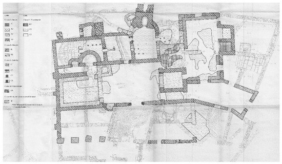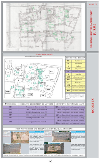 During field inspections, an “expeditious” survey was carried out on the material of the masonry systems and of the floor and wall coverings, from which a first general planimetry distinguished the types of construction element surviving (mortar, cocciopesto, stone) at the time and the shortcomings of the technical and archaeological drawings of La Torre as a form of basic support [2,4] (Figure 11). An exemplary “USM card” was developed for each element (masonry or cladding) that specified the construction techniques of the masonry, and highlighted its peculiar elements and both the material and morphological nature of the components.