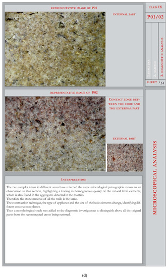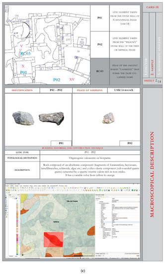 A sheet of the first series enters into the specifics of the individual elements that make up the USM, providing a side-by-side image of a technical–construction relief that illustrates, in detail, the subsequent description of “opus” and the texture used in their confection (Figure 12b). Once the macroscopic scale information is exhausted, the details of the constituent materials is entered into the following “sheets”. Thus, in the third sheet, the photograph of the sample on a real scale is enriched by the whole set of scientific data obtained from the laboratory analyses and the information that allowed us to extrapolate and deduce the same. The piece, univocally identified and planimetrically and altimetrically located, is filed according to dimensions and macroscopic characteristics determined from the preliminary autopsy analysis (inclusions, hardness, colour, etc.) and, where available and significant, the section is photographed (Figure 12c). A third sheet gives the outcome of the petrographic–mineralogical analysis of the stone samples and conglomerates with the description of the optical microscope observations or the SEM microscope observations to catch the otherwise unseen details (Figure 12d).