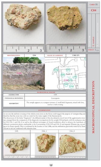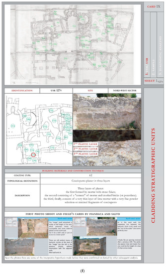 The USR cards faithfully follow the contents of the already described USM, as the analyses carried out on the material samples are the same. Only the last includes the diffractometric profile derived from IR technology analyses and a semiquantitative count and analysis of the main minerals present in the sample of the cocciopesto coating (Figure 12f–h).