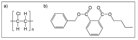 (a) Polyvinyl chloride (PVC) (CAS number 9002-86-2; used from 1943–1969; manufactured particularly by BASF); and (b) benzyl butyl phthalate (BBP), one of the most used plasticizer for PVC.