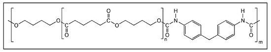 (B) The binders containing the magnetic particles (in particulate media) are typically polyester–polyurethane materials (PE-PU). The enormous number of formulations (different n and m values in Figure 8) give different polymers with specific chemical, physical, and mechanical properties [21,22,23] The amount of binder must be as low as possible, but sufficient to bind the high quantity of metal particles. It contains a hard part, given by the polyurethane chain (with high Tg, sometimes crystalline), and a soft one (with relatively low Tg), the polyester. The relative amount of soft and hard microphases, the degree to which they can separate and the resulting morphology have a strong effect on the copolymer’s ultimate properties and ageing [24].