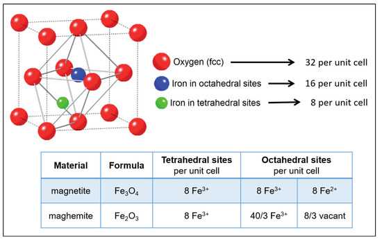 The most important iron magnetic oxides [34,35,36,37] are magnetite (Fe3O4) and maghemite (-Fe2O3), as shown in Figure 9. Magnetite is a black ferrimagnetic oxide containing both and ions forming two interpenetrating magnetic sublattices: occupies tetrahedral sites and octahedral sites are occupied by both and . Thus, the structure consists of octahedral and mixed tetrahedral/octahedral layers stacked along [111] direction. Below the Curie temperature (850 K), the spins of the tetrahedral and octahedral sites are antiparallel and have unequal magnitude: this causes ferrimagnetism (Figure 10). The spin arrangement is written as Fe3+[Fe3+Fe2+]O4. By controlling the particle size and morphology, magnetites with coercitivity ranging from 30 to 250 Oe can be produced. Particles smaller than 6 nm are super-paramagnetic at room temperature. If particle size of crystal is similar, coercitivity goes from spheres < cubes < octahedra according to the number of magnetic axes along these shapes. Maghemite occurs as a weathering product of magnetite and resembles magnetite in structure and magnetic properties. It is a red-brown ferrimagnetic oxide isostructural with magnetite but with cation deficient sites. The structure consists of two sublattices corresponding to located on tetrahedral and octahedral sites, cationic vacancies compensate for the oxidation of Fe2+ maintaining charge neutrality. Maghemite has a cubic unit cell, each containing 32 ions, 64/3 in both tetrahedral and octahedral sites (Figure 9) and 40/3 vacancies in octahedral sites. Measurement of Curie temperature is difficult because maghemite transforms to hematite (-Fe2O3) at temperatures above 700–800 K (TC has been estimated in the range 820–986 K) [38].
