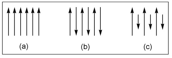 Arrangement of magnetic dipoles for different types of magnetism: (a) ferromagnetism; (b) antiferromagnetism; and (c) ferrimagnetism.