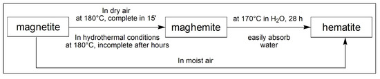 - Swaddle, T.W.; Oltmann, P. Kinetics of the magnetite–maghemite–hematite transformation, with special reference to hydrothermal systems. Can. J. Chem. 1980, 58, 1763–1772. [Google Scholar] [CrossRef]