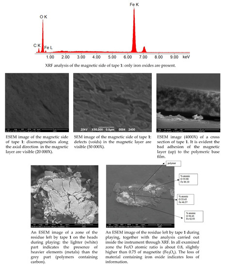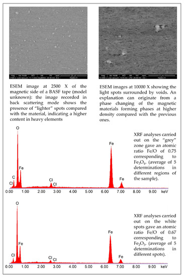 Additives, such as dispersive products to ensure homogeneity of the magnetic particle dispersion, fillers (abrasive as “head cleaning agents”), carbon black for anti-static effect, lubricants, and stabilizers (antioxidant or anti hydrolytic agents) can be present. All these chemicals, in time, depending on their nature and environmental conditions, can modify the structure, the morphology, and chemical and physical properties. The first problem to face is the identification of the components of the tape. A few manufacturers marked their name and type designation on the back of the tape, but this does not guarantee the consistency of production over the long term [53]. Furthermore, in many collections, reels and boxes were separated and different tape types were also spliced together. On the bright side, sometimes information is available concerning where and under what conditions the tapes have been stored [54].