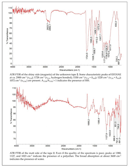 - Hobaica, S. Analysis of audio magnetic tapes with sticky shed syndrome by ATR-FTIR. J. Appl. Polym. Sci. 2013, 128, 1962–1973. [Google Scholar] [CrossRef]