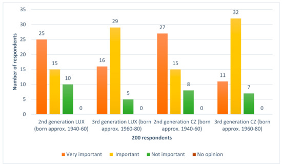 The graph below (Figure 1) clearly shows that family heirlooms are important for post-war generations, regardless of their origin or age. The survey also revealed that the second generation appreciates family objects slightly more than their descendants do, but it is evident that all generations value their relationship with inherited family items. These data suggest that the third generation does not significantly lose interest in the family’s tangible heritage. On the contrary, sometimes members of the third generation store family objects more carefully than their predecessors. The striking point is that each respondent provided a clear answer; that is, nobody selected the answer “No opinion”.