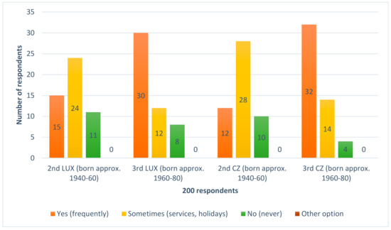 The preoccupation with work does not only result in less time being dedicated to Jewish family heritage, it also suggests that most of the respondents see their Jewishness as secular. In these conditions, Jewish religious authorities encourage its members to adopt more religious and cultural traditions because according to them only religiosity and the relationship with Jewish culture will preserve Jewish material family heritage for future generations [36]. The manifestation of deep Jewish faith is very rare in the researched areas, and it cannot be taken as the cornerstone for maintaining material family heritage. On the other hand, the acceptance of Jewish traditions is often accompanied by a certain amount of rationalization that may help maintain traditional customs or patterns of behavior associated with particular Jewish religious symbols and objects [37]. In both Luxembourg and the Czech Republic, elements of selective religiosity can be observed. People visit the synagogue only during the high holidays, and light up Shabbat and Hanukkach candles. From time to time, they observe a semi-kosher diet and prepare the Seder dinner with their relatives [38]. This lukewarm secular attitude corresponds with a slowly growing trend of wearing accessories with Jewish symbols that tends to replace deeper religious awareness.