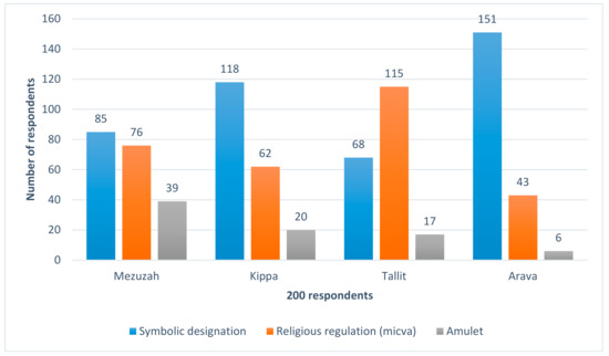 The last part of the case study (Figure 3) looks at the relationship with and perception towards selected Jewish ritual items (mezuzah13, kippa14, tallit15, aravah16). The graph below shows that the chosen items are seen as either symbolic designations or religious regulations rather than simple symbolic amulets. All these objects serve as indispensable spiritual objects, or at least as symbols encouraging Jewish self-awareness. To consider the aravah mostly as a symbolic item might show that many respondents do not celebrate Sukkot regularly since it is not one of the high Jewish holidays. A kippa is not just a religious sign; for many Jews, it is a symbolic designation of their identity. A large number of male interviewees said that wearing the kippa makes them feel like real Jews. Nowadays, many non-Orthodox Jews usually wear a crocheted smaller kippa in various colors and patterns, ranging from traditional to modern styles. The interviews showed that there are now also some humorous patterns (e.g., smiley faces for children). Nevertheless, it is still not possible to classify and cast Jews according to the type of headgear they choose. The look of the kippa depends on its owner and his taste. The research also shows a few cases in which girls embroider their names on the partner’s headgear as a sign of their relationship.17 Historian Maroš Borský states that the third post-Holocaust generation often uses traditional Jewish symbols because in his opinion Jewish adherence is no longer formed by transmitted religious values but is the result of a dissimilation process of socializing with young Jews abroad and subsequently gradually resuming contact with formal Jewish life [32].