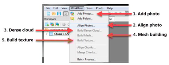 Figure 1). However, Metashape recommends masking all irrelevant elements on the source photos (such as the background and any accidental foreground) for better reconstruction results. Step 3, Metashape computes the photographs and builds the geometry (create a point cloud) of the scene. Users can edit and clean the unnecessary point cloud by cropping or removing extra floating objects before creating the mesh. The density of the point cloud (generated from step 3) can vary from normal, medium to ultra-high format, and later, the mesh (step 4) can be calculated by following any setting (from fine to high pre-set). Unwanted geometry/faces can be edited at this stage before building the texture (step 5). A user can use additional features (optional) to close holes (step 6) and export the model.