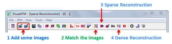 The workflow starts with adding image file (step 1); either by loading a .txt file containing relative image paths (NView Match) or by directly importing of multiple images. VisualSfM can automatically determine all the used parameters of the camera to acquire the photos. The next step (step 2), VisualSfM detect features in each image and find matches. It provides a variety of different algorithms for feature detection including Scale Invariant Feature Transform (SIFT) and SiftGPU (a GPU implementation of SIFT) [
