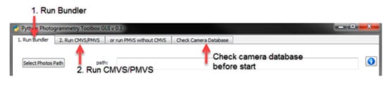 The Python Photogrammetry Toolbox (PPT) is free and open-source software that runs on various platforms (Mac OS, Linux, and Windows). The software was initially developed by Pierre Moulon and Alessandro Bezzi. The toolbox is composed of python scripts that automate the 3D reconstruction process from a set of pictures. The reconstruction process is mainly performed in two parts: camera pose estimation/calibration and dense point cloud computation. Open-source software such as Bundler for the calibration; and CMVS/PMVS for the dense reconstruction is employed to perform these intensive computational tasks. PPT GUI provides a 2-step reconstruction workflow. However, before starting step 1, we recommend checking the camera database. The terminal window will prompt for the camera model and sensor (CCD) width size if it is not in the PPT’s database.