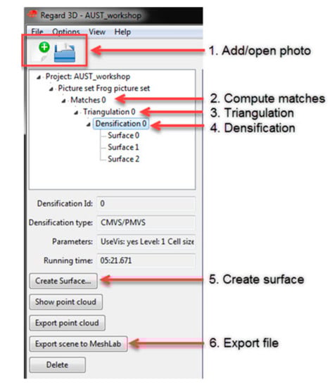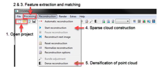 Figure 4). The user must show the program the present location of the images and where to locate the database (step 1). The user needs to start with the feature extraction (step 2) under the Processing tab; followed by the ‘feature matching’ (step 3). Then the user needs to reconstruct the camera positions, and produce a sparse point cloud. The start reconstruction command is located under the pull-down menu Reconstruction (step 4). COLMAP produces the 3D view while depicting cameras being added to the scene while it simultaneously forms the sparse point cloud. After completing this stage, the sparse cloud can be exported. A Bundle adjustment can be run before densification. Dense reconstruction (step 4) contains three steps, i.e. un-distortion, stereo, and fusion. The final step (step 5) is Meshing. All models can be exported as *.nvm, *.out, *.ply, and *.wrl file format.