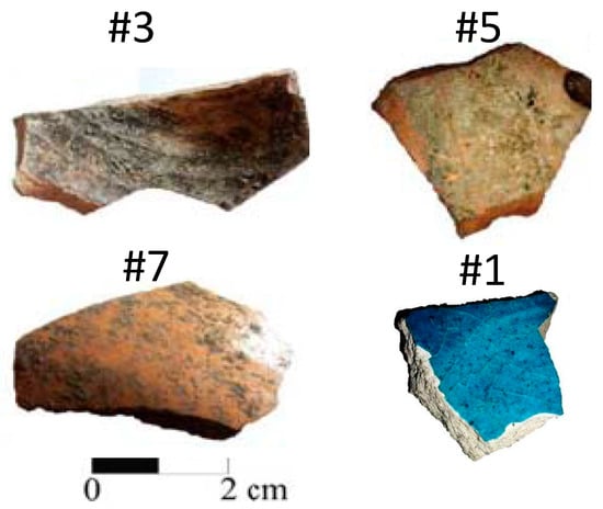 The shards probably come from domestic objects such as bowls, dishes or vessels. Based on the aforementioned preliminary archaeometric investigation [], samples were selected as representative of Group 1 (AZR3, AZR5, and AZR7) and Group 2 (AZR1), as the variety and differences of colors found in the site are concerned.