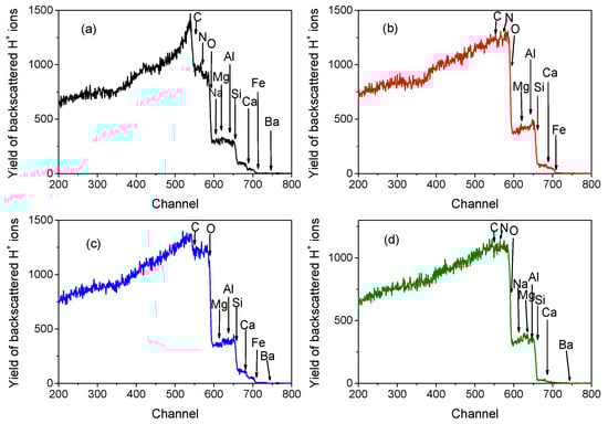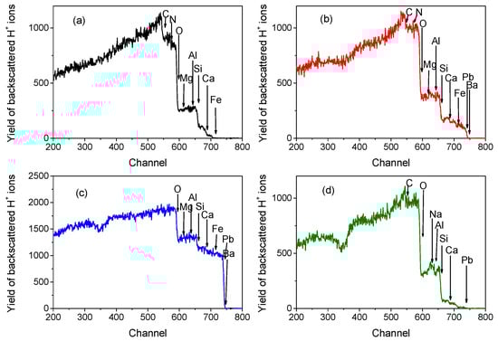 Worth of notice, the use of the SIMNRA code for the best-fit of the spectra allowed us to put in evidence three light elements, i.e., C, N, and O. The O-element is bound to the other detected elements, giving rise to oxides such as SiO2, Al2O3, CaO, Na2O, MgO, PbO2, and Fe2O3, BaO.