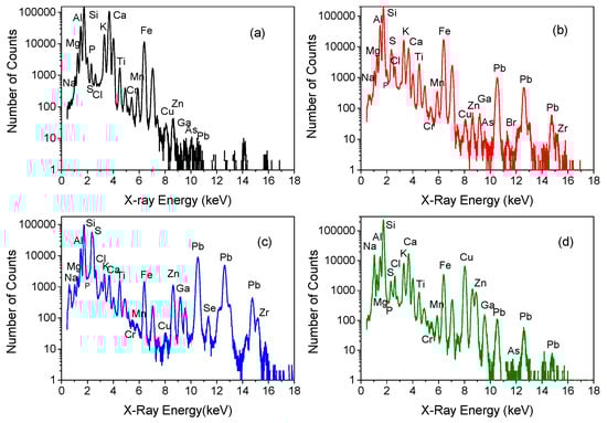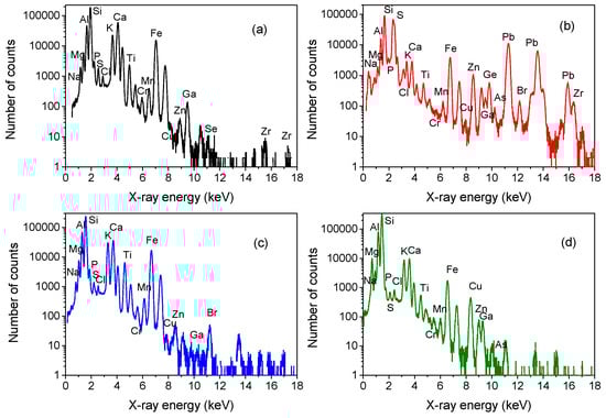 PIXE spectra of the unglazed back of the analyzed AZR3 (a), AZR5 (b), AZR7 (c), and AZR1 (d) potsherds. Each element is indicated only on the basis of its principal X-ray emission line.