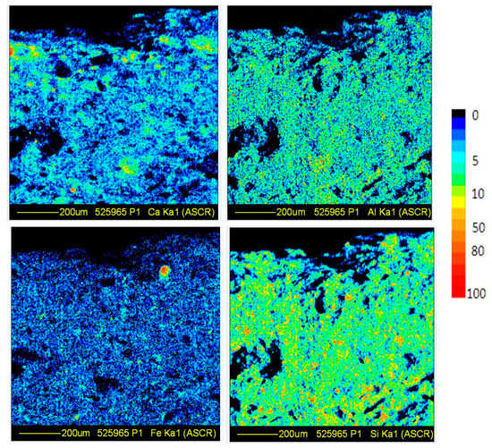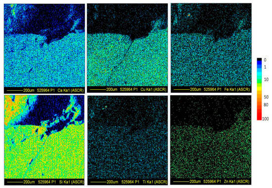 The obtained distributions for some of the main elements (Ca, Cu, Fe, Si, Ti, and Zn) are reported in Figure 9.