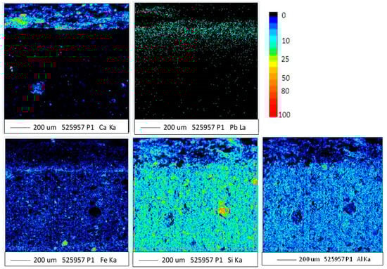 AZR 7 sample exhibits a uniform distribution of Si, Al, Ca and Mg-elements (data not shown). Worth of note appears, instead, the distribution gradients of some elements such as Fe and Pb observed in the cross-section close to the external glazed surface, reported in Figure 8. In particular, the surface layers show a significant Fe depletion, whereas Pb is detected in a very high amount.