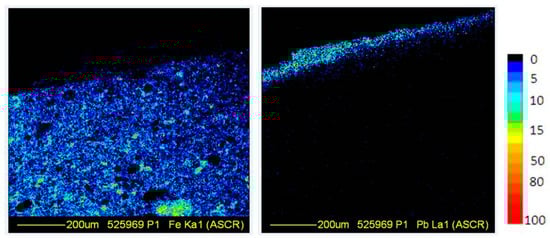 μ-PIXE maps for Fe and Pb detected in the cross-section close to the external glazed surface of the ARZ7 sample. Typical scale of the colors associated to the elemental concentrations is also shown.