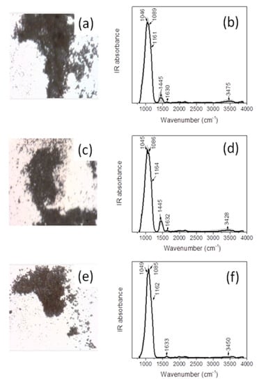 Photomicrographs, in white reflected light, and SR-FTIR spectra (average ± standard deviation) relative to the bulk areas of sample AZR3 ((a,b), respectively), AZR5 ((c,d), respectively) and AZR7 ((e,f), respectively). Average spectra (black line) have been obtained averaging 30, 40 and 18 sampled points within the shown areas for AZR3, AZR5, and AZR7 samples, respectively. Standard deviation of the spectra is graphically represented as light grey shadowed areas.