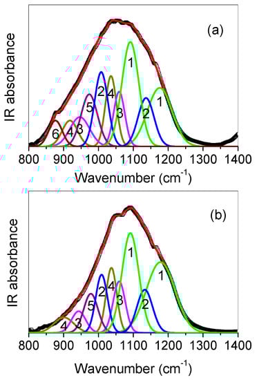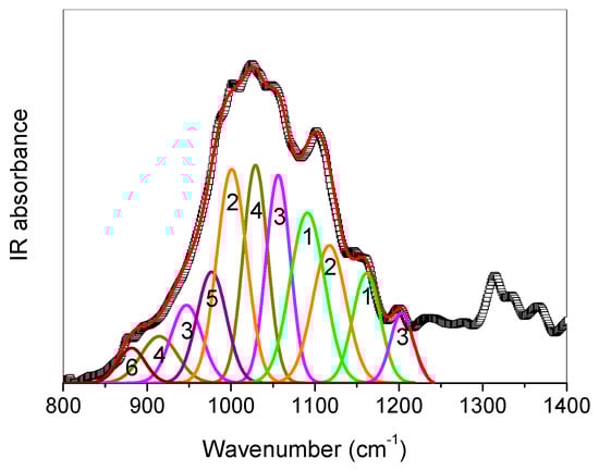 Deconvolution into symmetrical Gaussian profiles and curve-fitting of the (800–1250) cm−1 spectral range was performed, and the results of the best-fit procedure are reported in Figure 13.