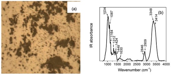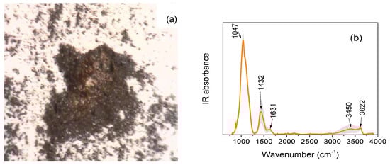 The collected average absorption spectrum reveals several peaks, that, based on comparison with database and literature [] could be attributed to burnt umber (features at ~1032 cm−1, ~1458 cm−1, ~3393 cm−1, and ~3625 cm−1), a deep brown color pigment obtained by heating raw umber, a natural clay pigment consisting of iron oxide, manganese oxide and aluminum oxide (Fe2O3 + MnO2 + nH2O + Si + AlO3), mixed with some organic binder that seems to be a fatty acid (features in the ~1300 ÷ 1700 cm−1 range, at ~2854 cm−1 and ~2923 cm−1).