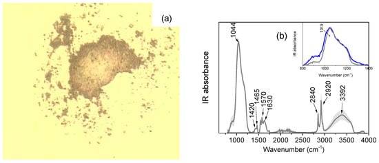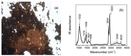(a) Photomicrograph, in white reflected light, of sample AZR3, relative to the black pigmented area, after being pressed within the Diamond Anvil Cell. (b) SR-FTIR average spectrum (average ± standard deviation) taken from the black pigmented area of sample AZR3. The average spectrum (black line) has been obtained averaging about 100 sampled points within the area shown in (a). Standard deviation of the spectrum is graphically represented as a light grey shadowed area.