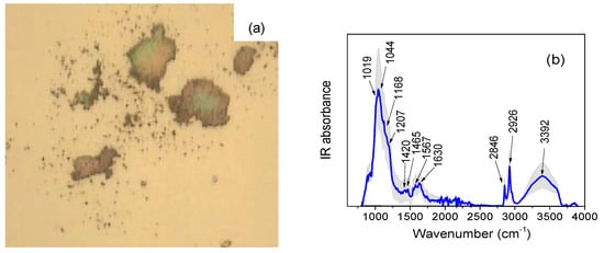 (a) Photomicrograph, in white reflected light, of sample AZR1, relative to the blue pigmented area, after being pressed with the DAC device. (b) SR-FTIR spectrum (average ± standard deviation) taken from the blue pigmented area of sample AZR1. The average spectrum (blue line) has been obtained averaging 8 sampled points within the bluer areas shown in (a). Standard deviation of the spectrum is graphically represented as a light grey shadowed area.