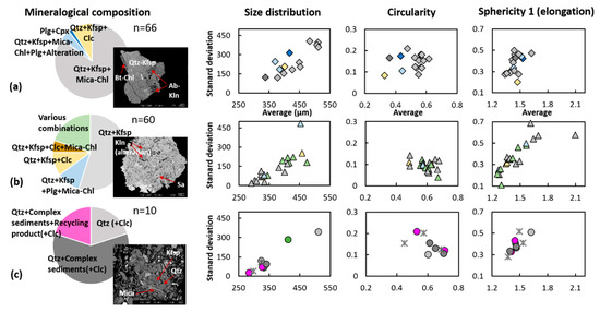 Mineralogical composition of dominant grain groups of the samples for the sites, (a) Ransyrt 1, (b) Kabardinka 2, (c) Levinsadovka–Saf’janovo with the back scattered electron (BSE) images of the representative grains [35] is compared to the size distribution, circularity and sphericity 1 of coarse sand grains (>250µm, lithoclasts) present in the selected samples (Clc: calcite, Cpx: clinopyroxene, Kfsp: K-feldspar, Sa: sanidine, Mica–Chl: mica–chlorite mixed layers, Bt: biotite, Ol: olivine, Plg: plagioclase, Qtz: quartz, Kln: kaolinite). Each mineralogical grain groups presented in different colors (Qtz + Kfsp + Mica – Chl/Qtz + Kfsp/Qtz (+Clc): light grey, Qtz + Kfsp + Plg + Mica Chl + Alteration/Qtz + Kfsp + Plg + Mica – Chl: light blue, Plg + Cpx: blue, Qtz + Kfsp + Clc: light yellow, Qtz + Complex sediments (+Clc): dark grey, various combinations: light green).