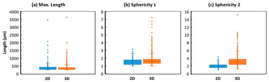 In this study, we calculated the following shape parameters: maximum length, circularity, sphericity 1 and sphericity 2 of an idealized ellipse that has the same normalized second central moments as the segmented object. They were defined as [39,40,41]: