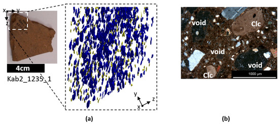 (a) Original ceramic sherd and segmented grain like cavities, calcite ghosts in the sample (blue and yellow) (voxel size: 25.003 µm3). (b) A cross polarized light micrograph of the cross thin section shows coexisting calcite grains and closed type of voids in different sizes (Clc: calcite).
