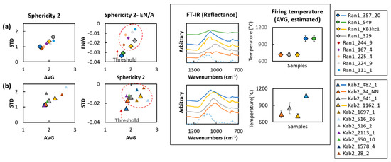 Average and standard deviation of sphericity 2 of pores and comparison between Euler number per unit area of the pores (A = 300x300 µm2) in average and sphericity of pores in average. Calculated from the pores (2D) present in cross thin sections of the samples from (a) Ransyrt 1, (b) Kabardinka 2. These parameters of four samples for each site (bigger maker with a boundary border) were compared to the reflectance Fourier-transform infrared spectroscopy (FT-IR) (aperture size: 70x70 µm2, reference: silver mirror) [35].