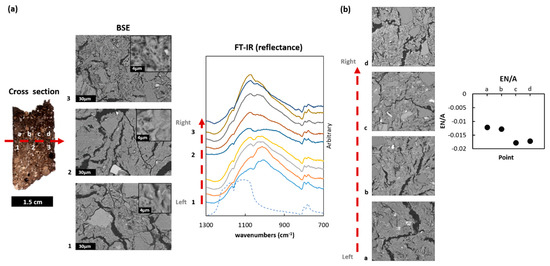 (a) Cross section profile of the reflectance FT-IR (aperture size: 70x70 µm2, reference: silver mirror, dashed line in blue: quartz) [35] and corresponding BSE images for the left side (1), middle (2) and right (3) of the sample (Ran1_167_4). (b) Cross section profile of the Euler characteristic per unit area and related BSE images from the left side (a) through left middle (b) and right middle (c) to the right side (d) of the same sample in a same direction. Calculated from the two-dimensional area of 300x300 µm2 on the cross thin section.