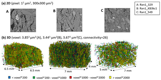 Comparison of the pore topology between (a) 2D and (b) 3D images of three samples varying in the degree of pyrometamorphic degree/sintering [35]. Estimated firing temperature for A: 700–850 °C, B: 700–850 °C and C: 950–1050 °C. The segmented pores show the difference of the firing degree between A and B more clearly.