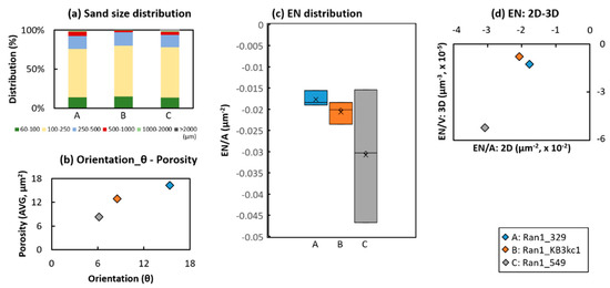 Comparison of sand size distribution calculated by (a) 2D images and (b) orientation of two-dimensional pores, (c) spatial distribution of the localized Euler number within a two dimensional unit area and (d) Euler number (average) derived from 2D images and that from 3D images (connectivity = 6). Samples (A, B, C) from the Figure 5.