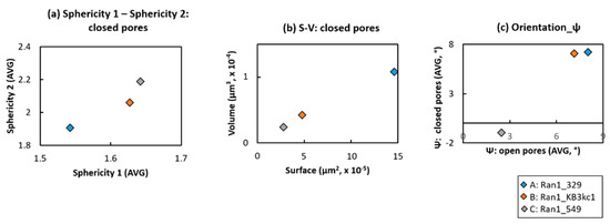 Relationship between the average of (a) sphericity 1 and sphericity 2 of closed pores and (b) surface area and volume relation of the closed pores and (c) the comparison of orientation degree ψ and the closed and open pores in average. All parameters derived from 3D scanning with the connectivity 26. Samples (A, B, C) from the Figure 5.
