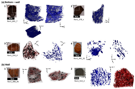 Photos of original ceramic sherds and segmented images of the large pore complex (blue) and sand grains (red and black) of the ceramics discovered at Ransyrt 1 (connectivity = 26). Region of interest (ROI) in the box of the white dashed line. (a) Bottom-wall fragments: 1) separate formation of the bottom and wall part (wall on the bottom), oriented parallel pressure/stress from the surface (voxel size: 29.053 µm3) 2) continuous formation of the bottom and wall part (voxel size: 29.633 µm3). 3. separate formation of the bottom and wall part (wall next to the side of the bottom) (voxel size: 24.313 µm3). 4. two layers for the bottom building (voxel size: 28.213 µm3). (b) Wall fragments: 1) mixture of regular and irregular alignment of sand grains (voxel size: 19.333 µm3). 2) Vertical orientation of the large pores in comparison to the alignment of the sand grains (voxel size: 9.493 µm3).