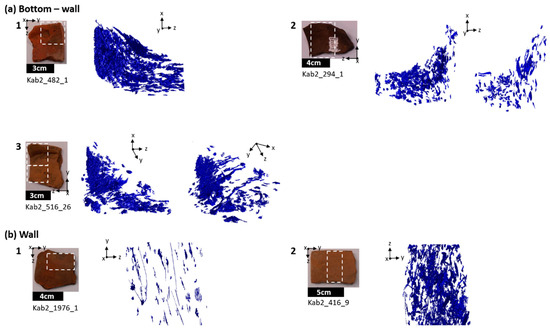 Figure 9 shows a classification of the inner formation of the bottom and wall part representative for Ransyrt 1. In the bottom-wall fragments, four types of alignments were identified: (1) most pores existing in the bottom plate are not connected to those in the wall. Only one long pore complex continues from the bottom to the wall. In the bottom plate, the pores are aligned parallel in the horizontal direction (Figure 9(a1)). (2) The pores from the bottom link to the wall. The pores in the bottom are lying parallel to each other (Figure 9(a2)). (3) The pores in the bottom and wall do not connect to each other. The pores of the wall are vertically aligned starting from the side of the bottom part (Figure 9(a3)). (4) The bottom plate consists of two layers (Figure 9(a4)).