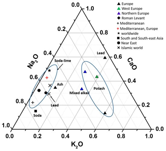 Variety of the glass flux compositions expressed in the Na2O-K2O-CaO relative ratio (for references see Table 1).