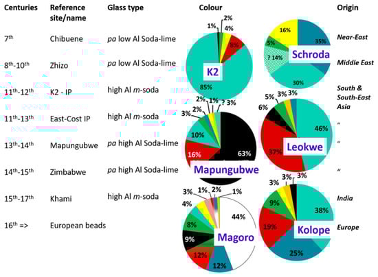 Wood’s classification system for beads imported into South Africa before the European contact has become the first step for archaeologists to classify beads at any site in sub-Saharan Africa. Figure 3 summarizes Wood’s classification of sub-Saharan glass trade beads based on morphology: eight series of beads are recognized and named according to the site where it was first studied and for which radiocarbon dates are available [43,120,121,122,123] (Figure 4). The great variation of colour that changed with time is obvious. The oldest series (7th–8th centuries) is linked to Chibuene, an Indian Ocean port located on the African coast of Mozambique, between the Limpopo and Zambezi River mouths. The beads are expected to have been produced in the Middle East. Chibuene series are made of low alumina (Al2O3 < 5%) plant ash glass and can be differentiated from the later Zhizo series by a lower magnesium (MgO < 3%) and higher potassium content [108]. The second ancient group is called Zhizo, after an earlier Iron Age cultural phase which expanded in most parts of South Africa between the 8th and 10th centuries AD [124]. The beads also arrived in South Africa through the port of Chibuene [108,123] and most of these beads were cut from drawn tubes. Figure 3 shows the colour distribution of beads from different sites (Schoda, K2, Mapungubwe Hill, Leokwe, Magoro Hill and Kolope) [121]. These low alumina soda-lime glass beads are blue, turquoise, yellow and rarely dark green. They were probably produced in the Near/Middle East [107].