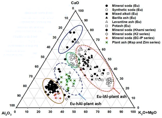Figure 5 shows the different types of glass composition based on Al, Ca and Mg+K oxide content in a ternary composition diagram. This type of diagram discriminates between high alumina and low alumina glasses (high alumina glasses are recognized as characteristic of South Asian and South European productions), potash and soda-lime glasses and the mineral from the plant ash glasses (Mg content). Beads excavated at Magoro Hill, an important site related to the Limpopo River trade and occupied almost continuously from the 7th to the 19th century AD [94], Other samples belong to Mutamba (13th–14th century AD) [82], Maryland and Parma (15th–20th century AD) as later Iron-Age sites in northern South Africa [128] as well as Baranda (16th–17th century AD) in Zimbabwe [95]. Six of the aforementioned series were identified. It is also possible to discriminate six European glass compositions as follows: soda-rich plant ash glasses from northern and southern Europe (15th–18th century AD), potash glass from central Europe (early 18th–mid 19th century AD), mineral-soda glass (recycled), synthetic-soda glass (19th century AD) and mixed alkali glass [128]. The southern European glass, except Venice productions, contains higher alumina (more than 3%) in comparison to the northern and central European productions [129].
