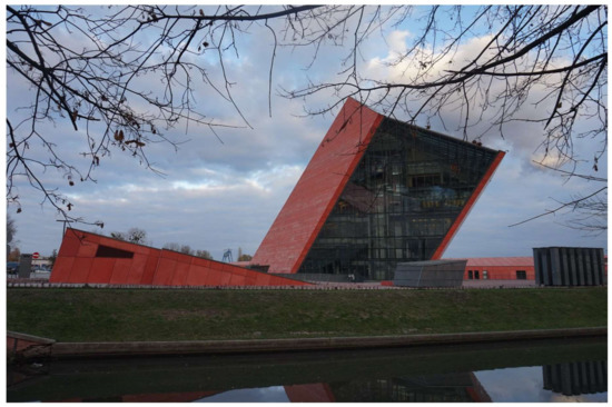 However, the more recent approach consists of constructing new contemporary memory places. While they still address events which are very much connected with the historical thinking of the city’s heritage, their impact extends far beyond the local. Two major investments in cultural infrastructure took place in recent years. The European Solidarity Centre was established in 2014 with the mission to: “Discover history and decide about the future”. It refers to one of the most important subjects for local contemporary memory and identity with an open-minded and comprehensive approach. Its main narrative is centered around the events connected with the August 1980 strikes which arose out of the Solidarity movement and led to the fall of communism in Poland in 1989. The fascinating modern building houses an interactive exhibition arranged with the help of many real objects which are sometimes rearranged into multi-media tools. Being predominantly a “narrative museum” [15] (p. 13) it makes extensive use of modern technology. However, it simultaneously encourages the individual and emotional experience of the exhibition, by illustrating the universalized history of freedom, told from the perspectives of its makers, such as the simple shipyard workers transformed from victims to victors. One follows its consecutive stages immersing in the mixture into the fear, hope, enthusiasm, and pride that builds the dynamics of the narrative. A very significant part of the building is its so-called “Winter Garden”, which is a meeting space in the inner courtyard, open for citizens to freely practice democracy on an everyday level. What is relevant is that the Centre has been located just on the edge of the historical shipyard, thus, becoming integrated into a historical dialogue with it. Further, its self-referential architecture brings to mind the body of an old rusty ship, an obvious allusion to the memory of the place itself.