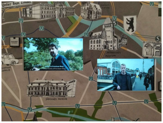 However, a very interesting departure from the traditional exhibition practice has been recently introduced in one of the major museums dedicated to the history of this city. Märkisches Museum (Museum of the Province of the March [of Brandenburg]) was established at the end of 19th century as a regional museum initiated out of the citizens’ need to commemorate the story of their own city. The hybrid brick architecture was a result of numerous inspirations. For many years, its constructor, Ludwig Hoffmann, maintained a traditional municipal collection and conservative narration about the city, which can still be observed in many parts of the museum. However, recently, contemporary elements have been introduced to the permanent exhibition, endowing it with a fresh and up-to-date touch. Vital current social and political issues are brought up, among them the situation of immigrants, local district traditions, and multi-cultural heritage. Sometimes new technologies come in handy but do not dominate the original historical identity of the museum. The main source of the new narration has been placed in the audio guide. The presented story is concentrated around eighteen main topics from Berlin’s history and is told in the first person by people or animated artefacts presented in the exhibition. Berlin itself (or rather herself) becomes one of the narrators, communicating with the listener in a friendly and familiar manner, immediately building an emotional and personal bond. Various Berliners share their own stories about the city in short film footage. Among them is the Dutch director of the museum, Paul Spies, who guides the viewer to his favorite places in Berlin while riding his bike through the city (Figure 2). Another interesting narrator is Romano, a rap musician who strongly identifies with Köpenick, a district in former East Berlin. Other parts of the exhibition, which did not undergo modifications, are accompanied by self-reflective commentary referring to the sole idea and aim of collecting and curating in museums. This is additionally closely connected with the educational program of the institution.