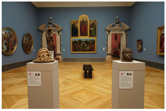 Another interesting experiment based on the strategy of inclusion this time focused more on tangible artefacts takes place in one of the major museums situated on Berlin’s Museums Island. In 2017, the Bode Museum transformed its permanent exhibition of European sculpture, introducing the project entitled: “Unvergleichlich. Kunst aus Afrika im Bode-Museum” [Beyond Compare: Art from Africa in the Bode-Museum] (Figure 3). In numerous museum rooms, side by side with chronologically arranged overview of the development of Western European sculpture, a parallel showcase takes place. Comparably to the canonical presentation of renaissance Italian marble busts or gothic German altars, the masterpieces of African art have been selected from the ethnographic collection, put into glass cabinets or placed on elegant pedestals in a fine arts museum. They have been juxtaposed with the European “classics” according to delineated fundamental themes, like power, death, beauty, identity, justice and memory. The aim of this presentation is not only an introduction of new perspectives on the classification of particular artefacts into broadly accepted canons. It also undertakes an effort to revise the stereotypes built around non-European artefacts, anticipating their comprehensive and egalitarian presentation in the Humboldt-Forum, which is due to be opened in 2019.