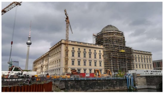 Speaking of the Forum itself, it will be located in a replica of Berliner Schloss (Berlin Palace), which in its original version was a symbol of military Prussia (Figure 4). Hence, the reconstruction itself, as well as the intention to locate there the exhibition of the ethnographical collection from Berlin museums, is the subject of a heated discussion. Highlighting the non-European tangible heritage in this way seems to be a tool to build a cultural bridge connecting Berlin with the rest of the world and making it the genuine capital of world cultures, and a credible one when bearing in mind the complexity of its memory and identity [19]. The afore-quoted Neil MacGregor, who is one of the founding directors of the Humboldt-Forum, views this institution as another dream come true, presenting Berlin as a peaceful place of inspiring dialogue of cultures framed within the building, which is a new (and perhaps very peculiar) memorial to the complex German past [18] (p. 558–559).