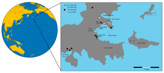 As part of the overall Battle of Midway operation, Japanese forces occupied Kiska on 6 June 1942 and nearby Attu the following day. While the main objective to establish a base on Midway failed, the Aleutian component was a success [21]. In the subsequent months, the Japanese developed Kiska into a base from which to mount seaplane and submarine operations in the Northern Pacific. The base, which, at the height of development saw over 5000 Navy and Army troops stationed there, was well defended by an array of coastal defense and anti-aircraft (AA) guns. The U.S. attempted, in vain, to dislodge the Japanese by long-range aerial bombardment [22], which was hampered by bad visibility of the target and adverse flying conditions. With the U.S. forces successfully recapturing Attu on 30 May 1943, the Kiska garrison became unsustainable, as the island was isolated and could only be supplied by submarines. As an American and Canadian force of more than 34,000 men prepared to invade Kiska, a Japanese evacuation fleet managed to slip through the fog, board the 5100 troops in less than one hour and escape without being detected [14].