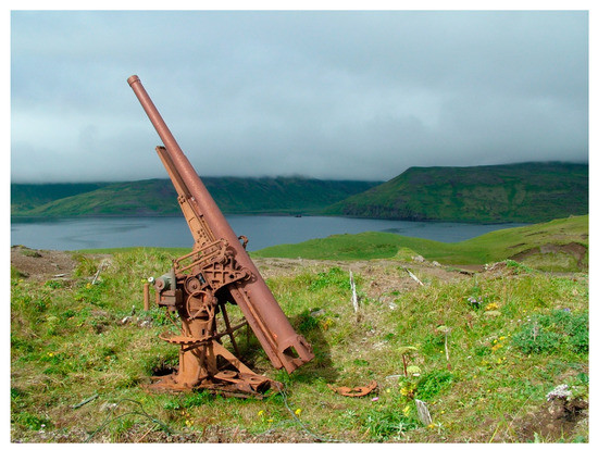 A recent assessment of the cultural landscape of the World War II battlefield of Kiska (Aleutian Islands, Alaska) examined the extent to which the extant heritage items and sites represented the various phases of the Battle for Kiska and made recommendations on how the cultural landscape should be managed [14]. Prior fieldwork on Kiska had shown the presence of a wealth of World War II material culture and landscape features, all in an excellent state of preservation [15,16].