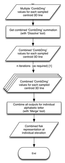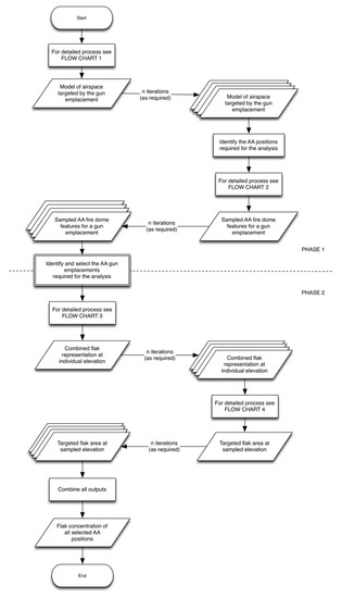 The overall estimate of flak concentration comprised four discrete workflows with all workflows having a range of iterations based on the required variations to input settings, thereby generating a series of discrete outputs. These outputs then formed the input for the next workflow, with the last set output combined to achieve the final representation (Figure 5).