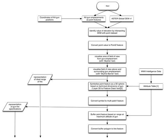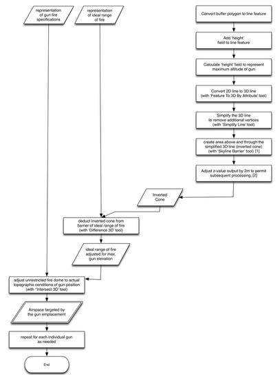 With the release of Esri ArcGIS 10.0, a new suite of 3D spatial tools became available, primarily the ‘skyline’ and ‘skyline barrier’ toolsets. These tools have so far not been applied to a cultural resource management situation. For the specific case under discussions, these tools provided an opportunity to analyze and visualize the extents to which AA gun emplacements could target an attacking aircraft. An instructional method for performing analysis of threats posed by AA guns was provided by Esri to outline the functions of the 3D tools [55], but the models representing AA guns are too simplistic and do not reflect the technical specifications of individual AA guns. The methodology discussed here is a novel approach.